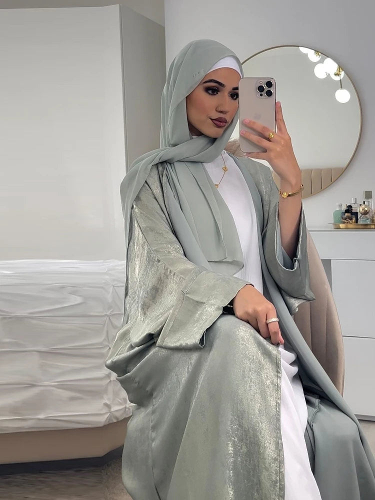 Designed in luxurious bronzing satin, this long-sleeve style combines elegance with modern sophistication. Made from 100% polyester, it features a smooth, lightweight feel and a flattering free size fit, suitable for a wide range of body types. Available in stunning shades of light purple, light green, light blue, pink, apricot, and brown, the design is elevated with refined leather stitching and a striking gilded finish for a touch of glamour.
