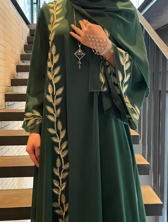 This elegant long-sleeve dress is crafted from high-quality polyester fiber, ensuring both comfort and durability. Available in pink, khaki, and dark green, it features a sophisticated bell sleeve design and a full-length skirt that exudes grace. The dress is enhanced with delicate lace details and intricate embroidery, highlighting its refined craftsmanship. Offered in sizes S through XXL, it combines style, versatility, and a flattering fit for various occasions.